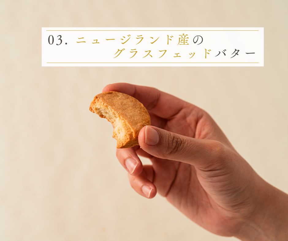 ニュージーランドの大自然で育った牧草だけを食べて育った牛から生まれた、こだわりのグラスフェッドバター。豊かな牧草地で育まれたバターを使ったサブレは、ミルキーで滑らかな口当たりと、深いコクが特徴です。