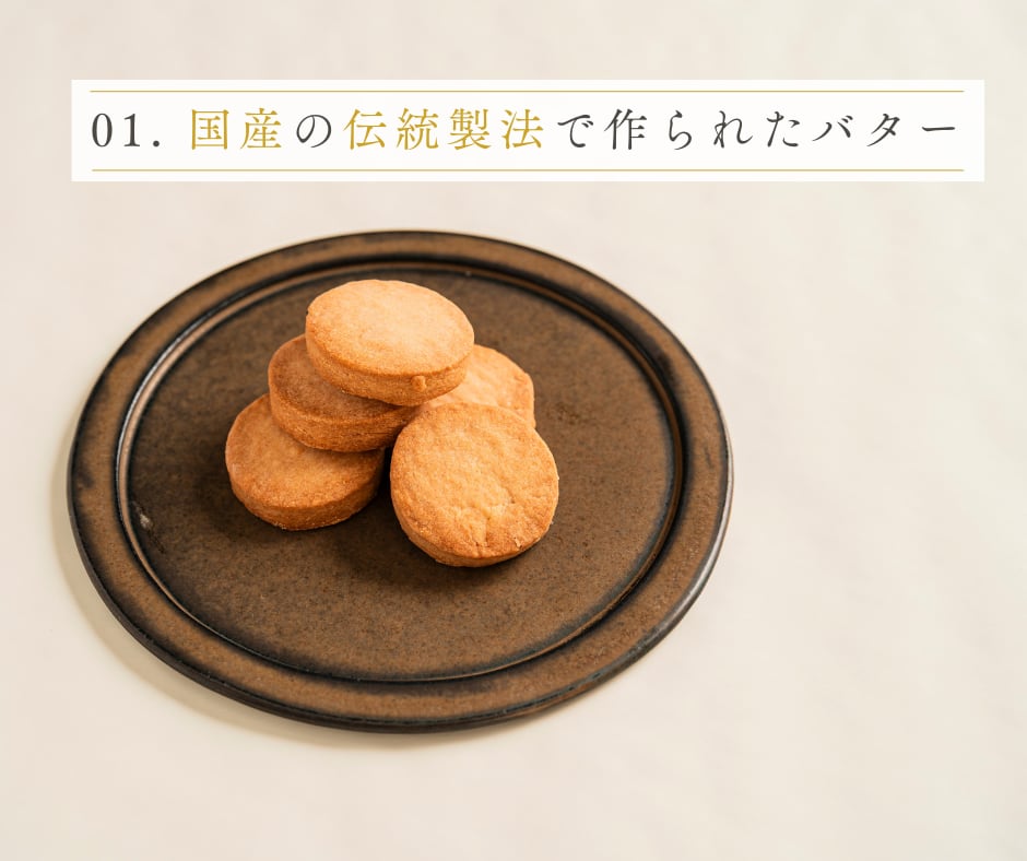 北海道根釧地区産の生乳から作られるクリームに乳酸菌を加え低温で長時間発酵させ、ドラム式のチャーンでじっくり練り上げる伝統的製法を採用した高級発酵バターです。ミルキーで優しい味わいが口いっぱいに広がり、素朴でありながら口どけの良いサブレに仕上がります。